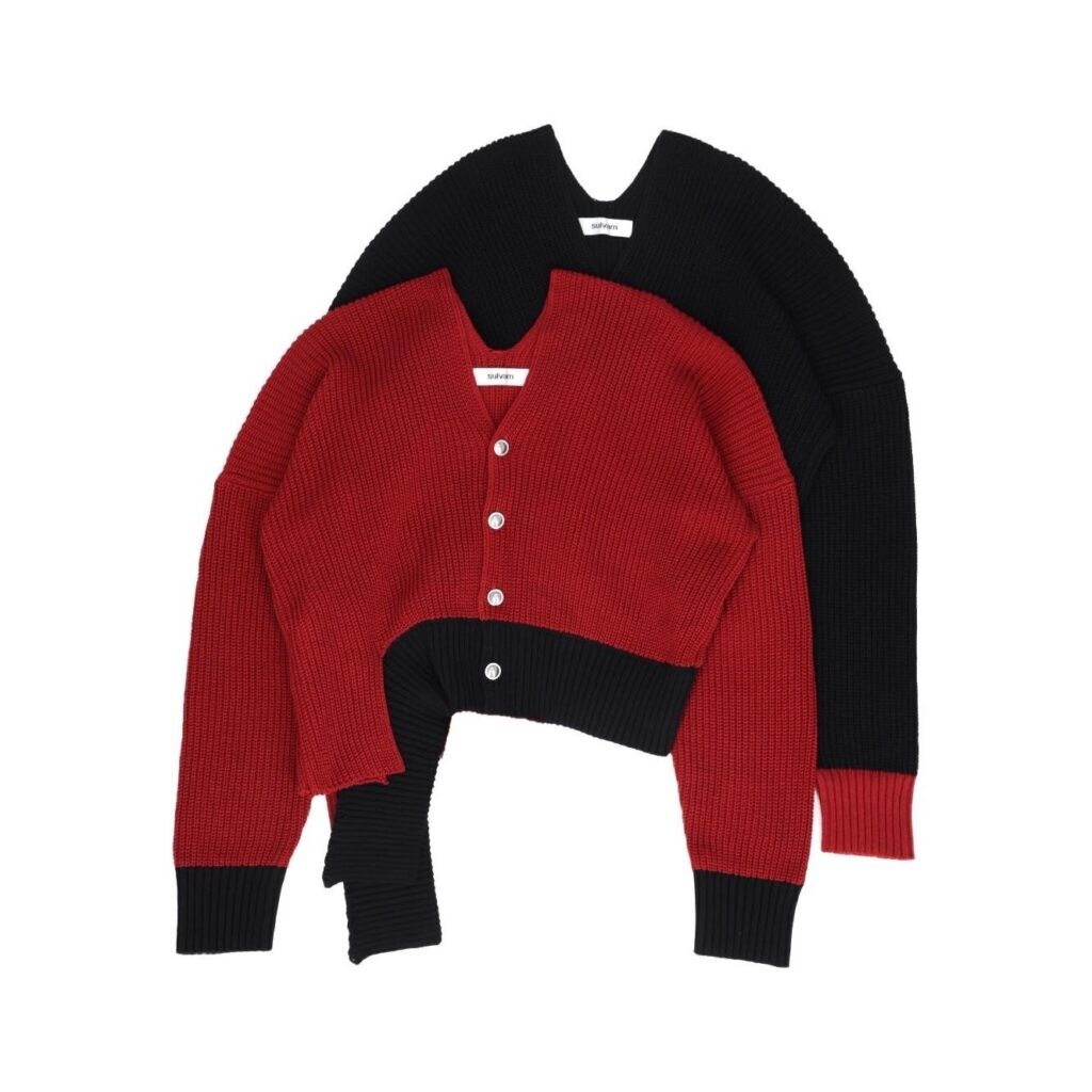 今回用意される限定アイテムは、裾のリブをアシンメトリーに垂らした独創的なニットカーディガン。ショート丈のコンパクトなシルエットにドロップショルダーを組み合わせ、シルバーボタンをあしらったミニマルなデザインをベースにしながら、ブラックとレッドの大胆なカラーコントラストで仕上げた一着だ。クラシックなカーディガンに前衛的なニュアンスを加えることで、ユニセックスに着こなせる現代的なアイテムへと昇華している。