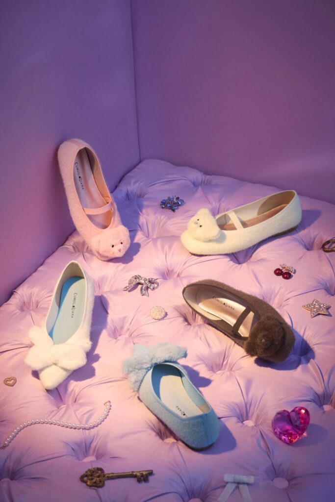 さらに、季節感を引き立てるふんわりとした装飾アイテムも充実。小さなベアのぬいぐるみをトゥ部分に施したフラットシューズはユーモラスで可愛らしい存在感を放ち、ファー素材のリボンをあしらったパンプスは暖かみを感じさせ、秋冬らしいスタイリングのアクセントとなる。思わず笑顔がこぼれるような愛らしいデザインは、履く人の気分まで軽やかにしてくれる。