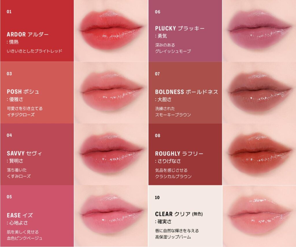 カラーバリエーションは全8色。華やかなレッドやローズ系から、落ち着きのあるベージュ・ブラウン系まで揃い、オンオフ問わず幅広いシーンに対応する。たとえば、鮮やかなブライトレッド「01 アルダー 情熱」や、女性らしいイチジクローズ「03 ポシュ 優雅さ」は、顔まわりを華やかに彩るカラー。一方で、肌なじみの良いピンクベージュ「05 イズ 心地よさ」や、クラシカルな印象を与えるブラウン系「08 ラフリー さりげなさ」などは、落ち着いたメイクにも活躍する。さらに「10 クリア 確実さ」は、高保湿リップバームとしても使え、自然なツヤをプラスできる万能アイテムだ。