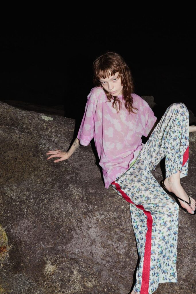 シアーな透け感のニットTシャツには、月明かりに浮かぶ植物の影をイメージした白いシルエットをプリント。幻想的で静謐なムードを漂わせる。一方、ワイドデニムパンツにはブリーチ加工で夜の海の揺らぎを抽象的に描き、ストーンウォッシュを施したカーディガンには経年を思わせる温かみを持たせた。