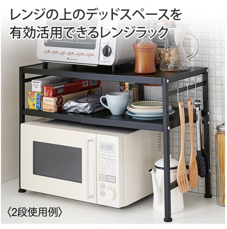 「レンジラック伸縮2段」は、幅が約41.5~65.5cmまで調整できる伸縮タイプ。電子レンジやトースターの大きさに合わせて設置できるので、無駄なスペースをつくりません。さらに2段仕様になっており、上段にはケトルや調味料、下段には食器や小物を置くなど、アイデア次第で幅広く活用できます。