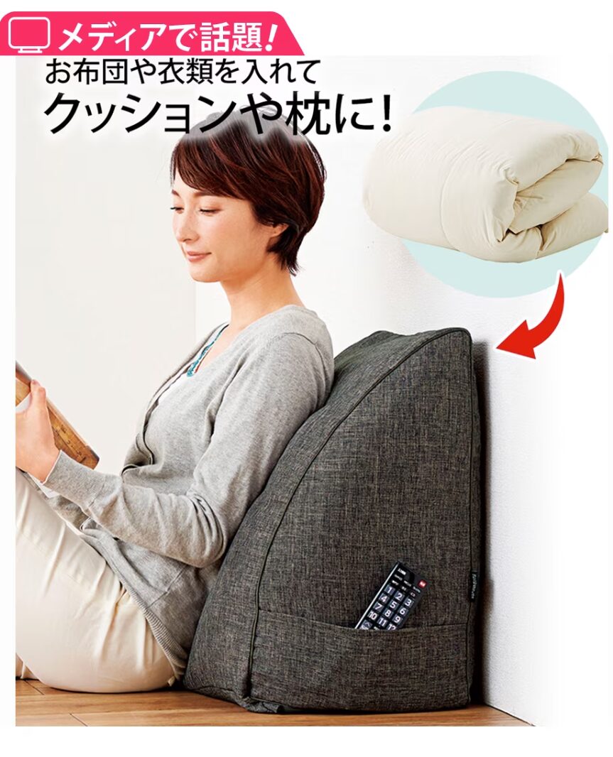 また、収納袋の形状は安定感があり、座ったり背もたれとして使ったりできるクッション機能も搭載。収納したままリビングや寝室でくつろぐこともでき、日常生活に自然に溶け込むマルチユースが魅力です。