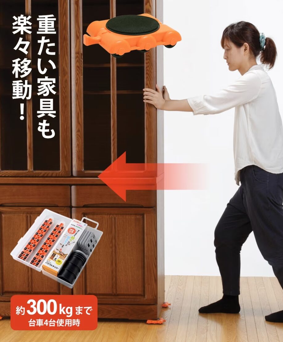 このセットの魅力は、なんといっても「一人で家具を楽に移動できる」という点です。従来の家具移動では、複数人で持ち上げたり滑らせたりする必要がありましたが、このセットがあれば持ち上げ棒と台車を組み合わせることで、少人数でも安全に家具を運べます。重たい家具や複雑な形状の物も、滑らせて移動できるため、床や壁を傷つけるリスクも軽減されます。