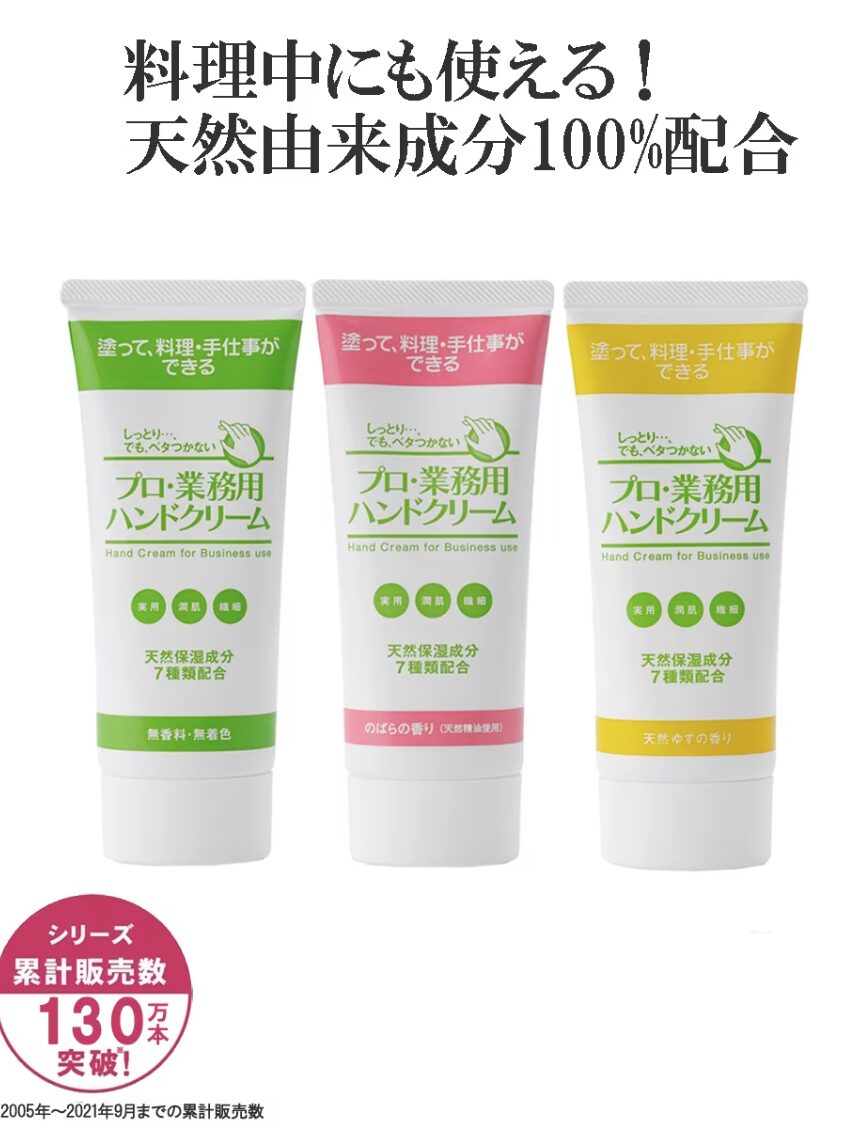 「プロ・業務用ハンドクリーム 天然由来成分100%配合」は、手荒れに悩む方や料理・手仕事をする方に最適なハンドクリームです。主成分のハイブリッドヒマワリ油により、しっとりしながらベタつかず、作業を中断せずに使えるのが大きな魅力。無香料・ゆず・のばらの3種類の香りから選べるので、用途や好みに応じて使い分けできます。