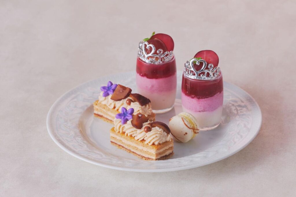 今回のアフタヌーンティーは、旬を迎えるぶどうやマスカット、香り豊かな栗をふんだんに使用し、淡い紫色を基調にしたエレガントな世界観でまとめられている。まるで物語のプリンセスを思わせる華やかな彩りと、果実の甘みや酸味を活かした奥行きある味わいが特徴だ。