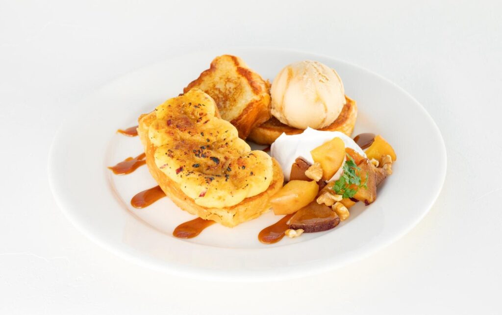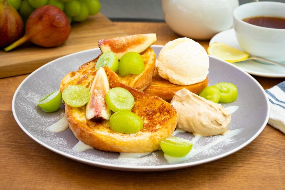 さらに、同日からは別の秋限定フレンチトースト「スイートポテト&アップル」も登場。ブリュレ仕立てのスイートポテトと、キャラメリゼしたさつまいもやりんごを組み合わせ、香ばしさと甘さが交錯する贅沢なプレートに仕上がっている。シャインマスカットといちじくとはまた違った秋の味覚を堪能できる一品だ。