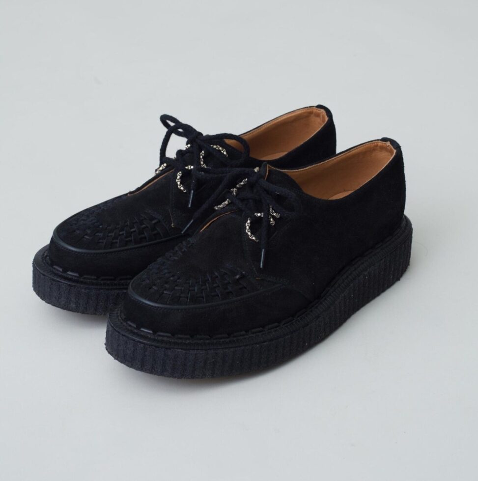 ラインナップは全3型。ブラックスエードとピンクスエードで彩られた「スキプトン」、そして滑らかなブラックレザーを用いた「ダイアノ」。いずれも厚底のラバーソールを備え、ジョージコックスならではのロックな佇まいを放ちながら、ホーセンブースのジュエリー的なアクセントが存在感を際立たせる。