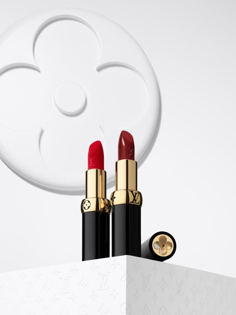 「LV ルージュ」は全55色展開。なめらかに溶け込むサテンタイプと、立体的なマットタイプの2種類を揃え、シアバターとヒアルロン酸を配合した処方で長時間の潤いを実現。シグネチャーカラーとして、鮮やかなレッド「896 モノグラム・ルージュ」、深みのあるローズ「203 ローズ オデッセイ」、強烈なスカーレット「854 ルージュ ルイ」が登場する。