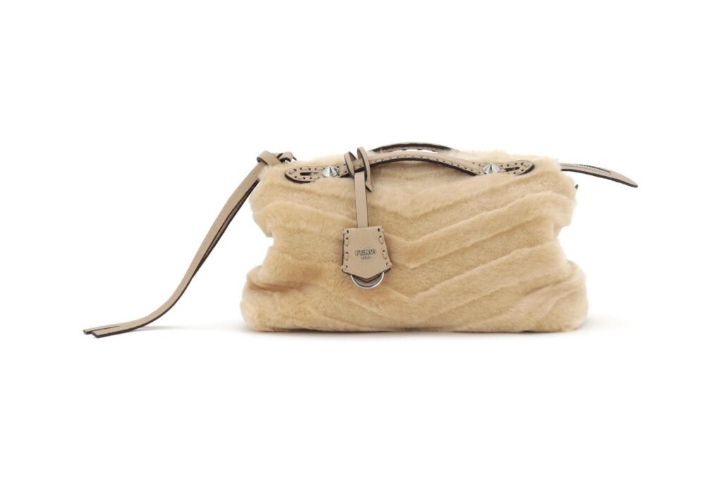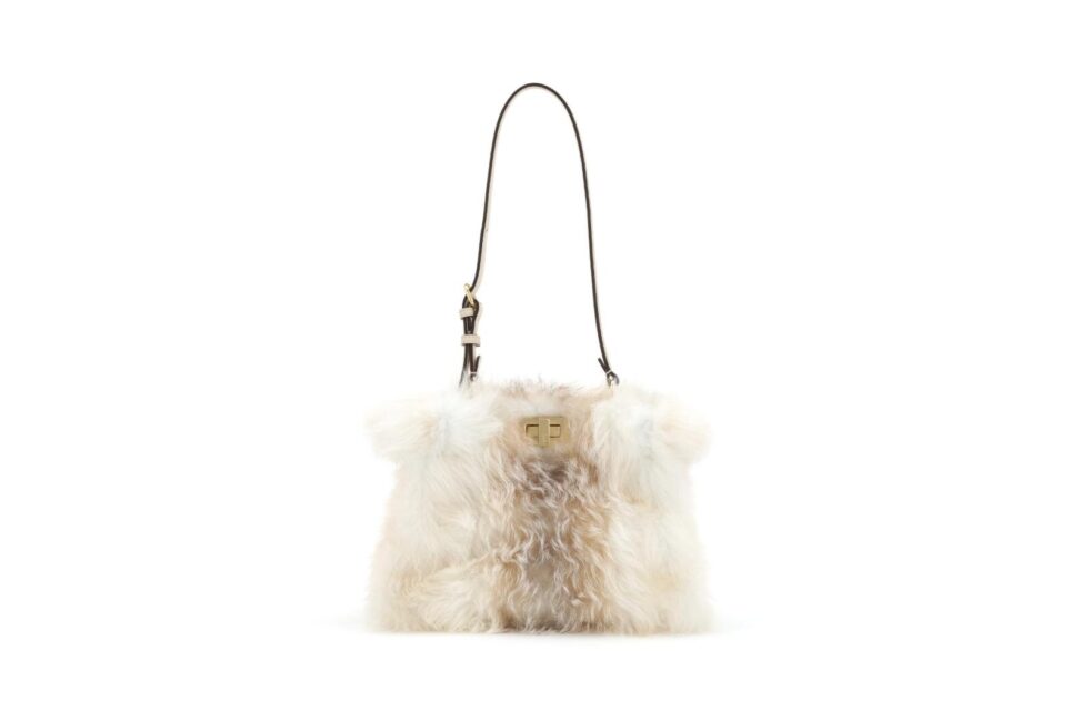 中でも目を引くのは、アコーディオンのようなフォルムが特徴のトートバッグ「ピーカブー ソフト ラージ」。密度の高いシアリングを贅沢に全面に使用し、手作業によるペイントで中央に上品な陰影を加えることで、エレガントで洗練された雰囲気を漂わせている。上質ファー特有の艶めきと立体感が、コーディネートの主役となるバッグだ。