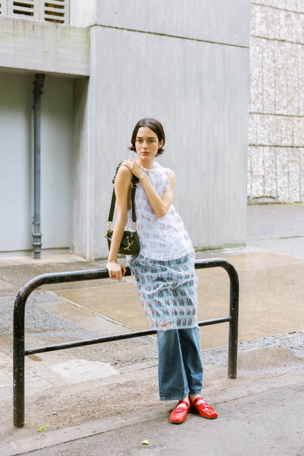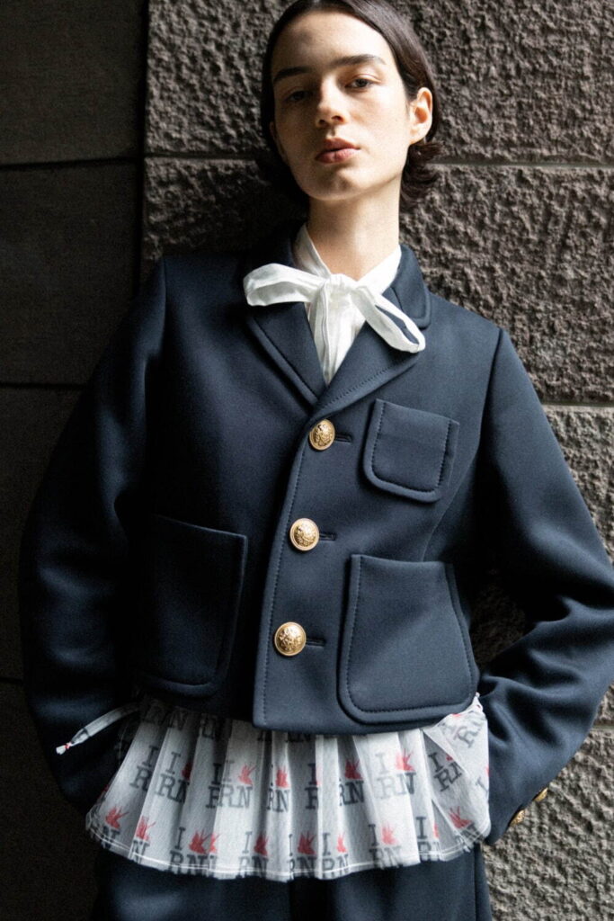 象徴的に登場するのは「I Love RN」の総柄ロゴを配したチュールウェア。よく見ると、ハート部分にはブランドアイコンであるツバメが潜み、ユーモアと独自性を演出。ドレスやパンツ、ヘッドウェアに至るまで、アクセントとして随所に散りばめられている。