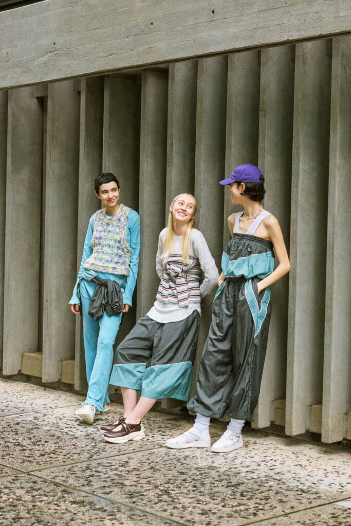 アメリカンカジュアルの粗野な雰囲気を和らげる工夫も印象的だ。M-65ジャケットは、大ぶりのポケットやミリタリー要素を踏襲しつつ、光沢感あるサテン生地で仕立てることで上品に昇華。胸のパッチや腕章も同系色でまとめ、都会的な空気を纏わせている。カレッジスウェットのパーカーには切りっぱなしの襟元を取り入れ、縁がくるりと丸まることで古着のような抜け感を醸し出した。