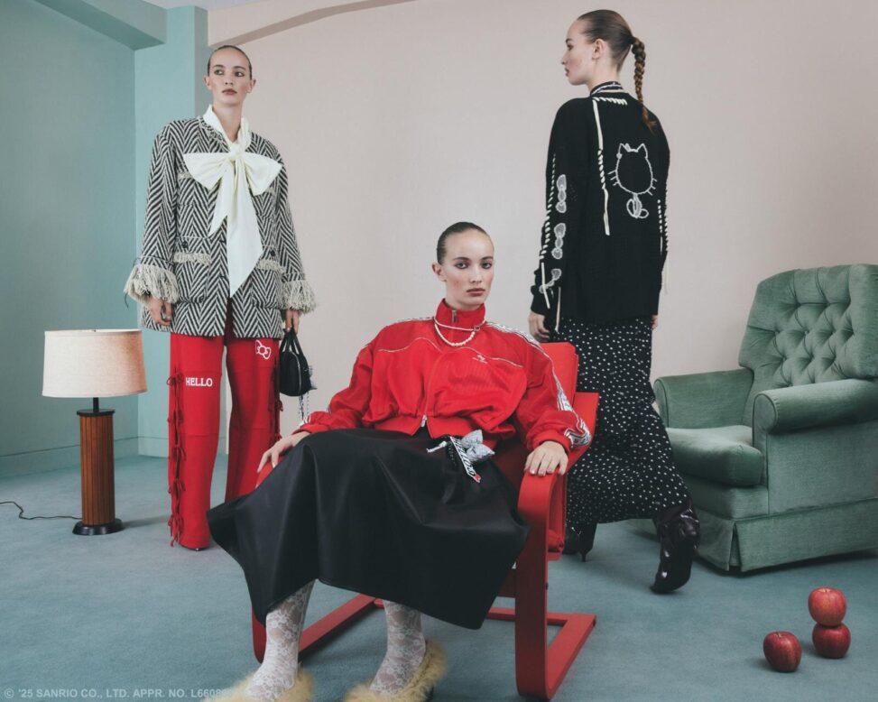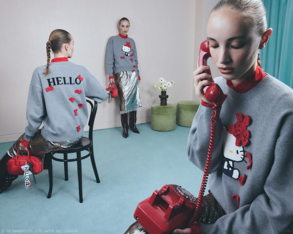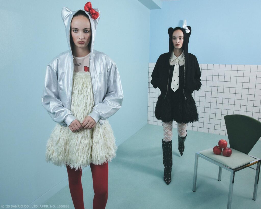 今回のコレクションは、ハローキティが誕生した1970年代のムードを反映させたデザインが特徴。クラシカルなリボンモチーフをふんだんに散りばめながらも、モードな解釈で仕上げたウェアがラインナップする。