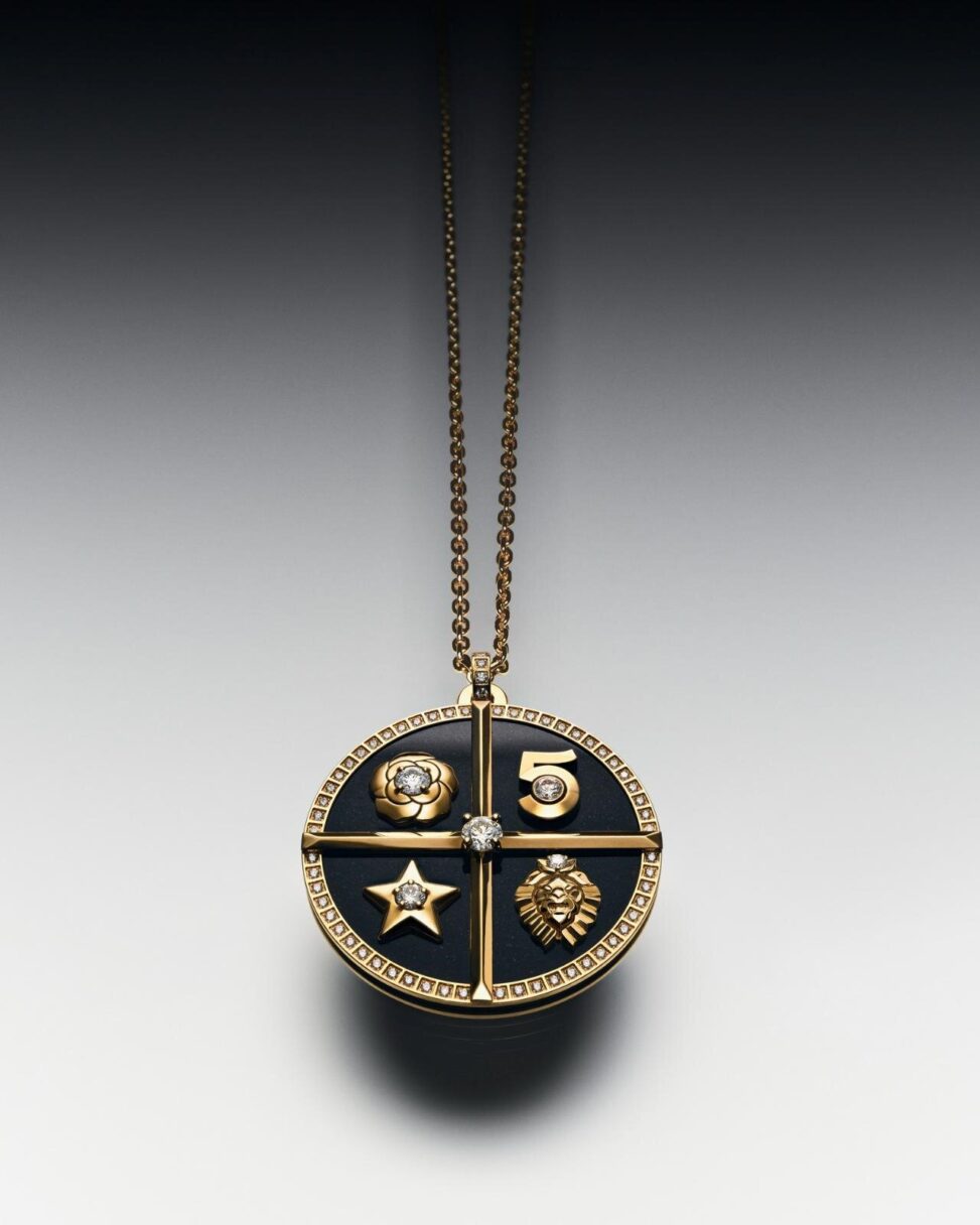展開されるネックレスは2種類。「シンボル メダル」は、アンティークコインを思わせるラウンド型のペンダントトップを採用。表裏どちらも身に着けられるリバーシブル仕様で、気分やコーディネートに合わせて楽しめる。表面には4つのシンボル(彗星、ライオン、カメリア、数字の5)が並び、裏面は「CHANEL」のロゴを無限に繋げたゴールド一色のシンプルなデザイン。スライド式の留め金によりチェーンは最長80cmまで調整可能で、ロングネックレスとしても使える。