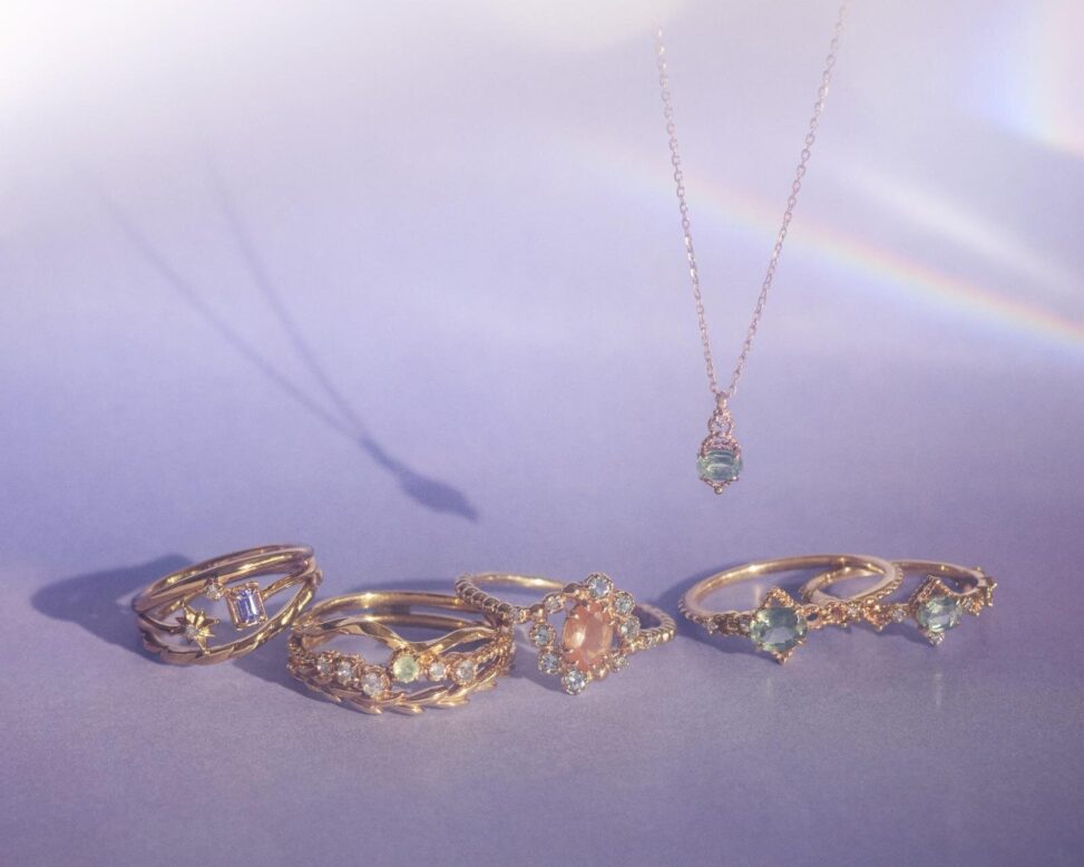 また、ミントグリーンが爽やかなカイヤナイトリングは、透かし模様やミルグレイン細工によって繊細さを引き立て、儚げな魅力を演出。まるで2本のリングを重ねづけしたかのように見える「トリックリング(Trick Ring)」も新作として登場し、遊び心を感じさせるデザインとなっている。