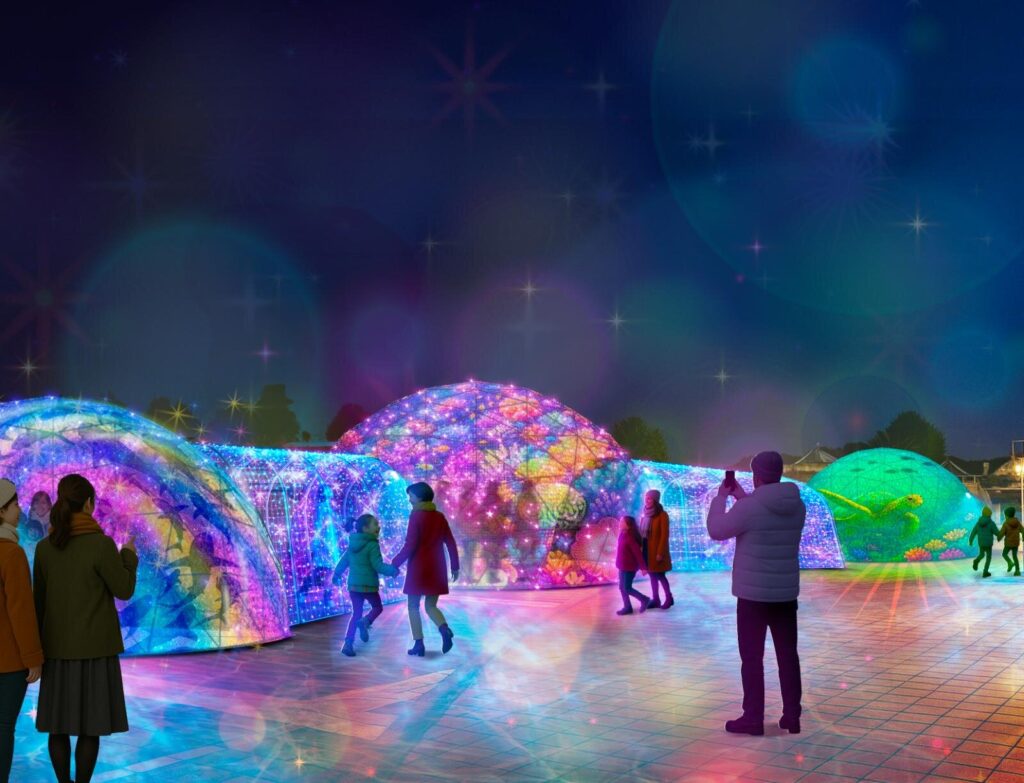 2025年のテーマは“光と水”。今年初登場となる「マリンファンタジア」では、3つのイルミネーションドームの中に魚のシルエットや鮮やかなサンゴが映し出され、青く輝くトンネルを抜けると、まるで海中を散策しているような没入体験が広がる。足元に揺らめく青い光が水面を再現し、訪れる人を幻想的な海の世界へ誘う。