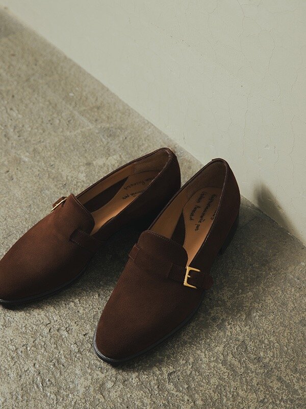 アッパーには、英国の老舗タンナー「チャールズ・F・ステッド(CHARLES F. STEAD)」社製の上質スエードを採用。発色の良さと耐久性に優れ、履くほどに足に馴染む素材だ。落ち着いたブラウンのスエードに、存在感を放つゴールドバックル付きストラップを合わせ、気品と個性を兼ね備えた仕上がりとなっている。流れるような曲線的なラインが特徴的で、上品さと遊び心を併せ持つデザインが魅力だ。
