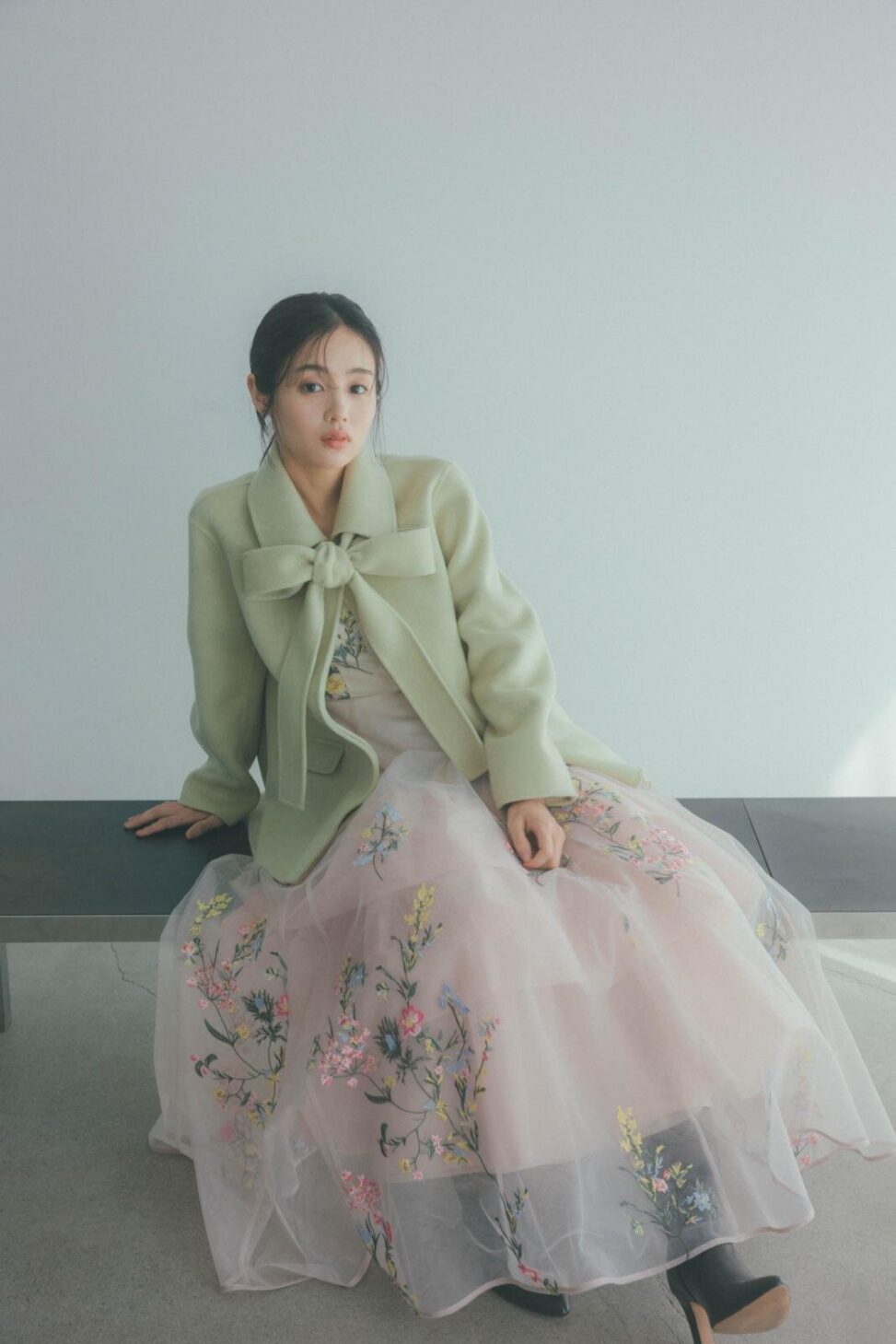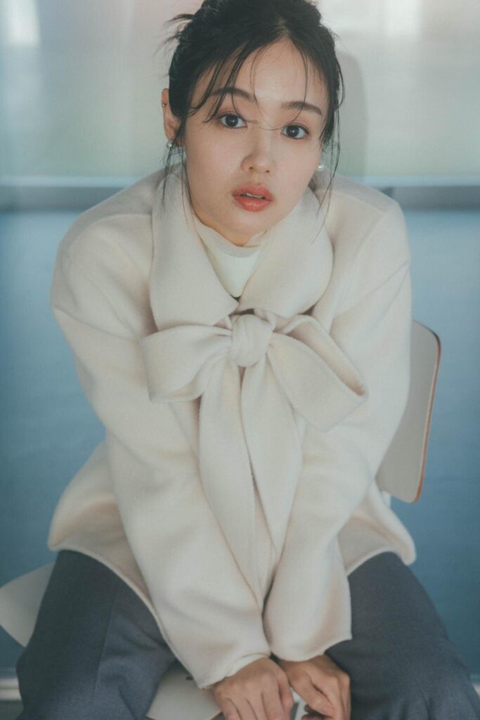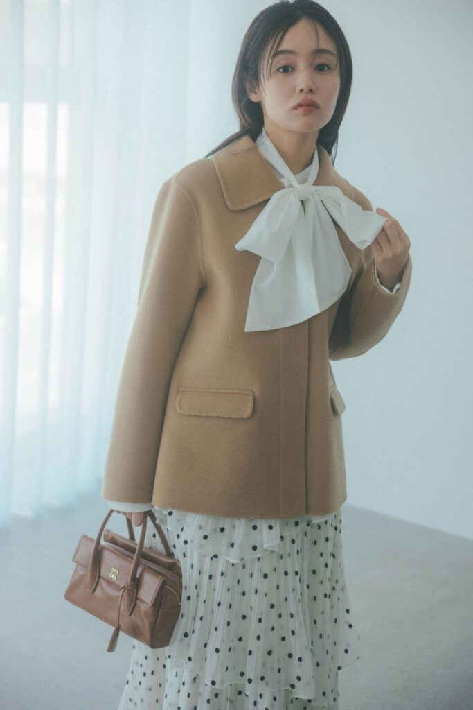 コレクションの目玉となるのは、首元にリボンをあしらったステンカラージャケット。リボンは取り外し可能で、シーンに合わせて可愛らしさとクラシカルさを使い分けられる。大きめの襟がアクセントとなり、ショート丈ながらも存在感のある一着だ。軽量で暖かい素材を採用しており、ヒップを覆う丈感とすっきりとしたシルエットで、幅広いコーディネートに馴染む。