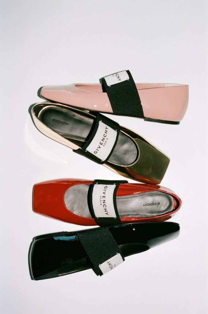 アッパーには、バレエシューズの柔らかさを保ちながら存在感を際立たせる幅広のバンドを配置。このデザインは、当時のカクテルドレスに用いられたウエストベルトをイメージしており、女性らしいシルエットを想起させる仕掛けとなっている。さらに、甲部分には“GIVENCHY PARIS”のロゴを刻印したレザーラベルを大胆に配し、ブランドのアイデンティティを強調。シンプルな構造の中に、ラグジュアリーなアクセントを効かせている。