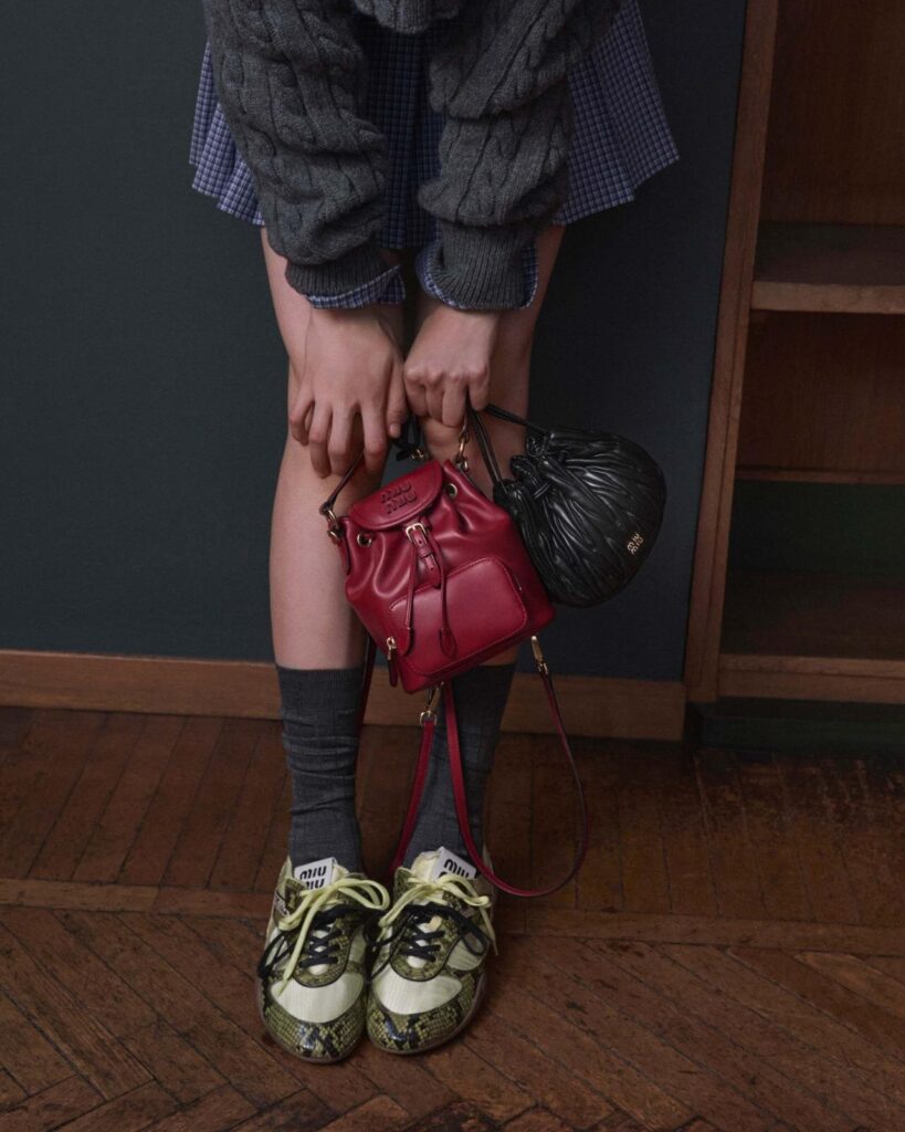 「ミュウミュウ アテネウム」は、伝統的なカレッジスタイルを現代的に再解釈し、ミュウミュウならではの遊び心を加えたコレクション。学生風のクラシカルなアイテムを軸にしながら、モード感とチャーミングな雰囲気を兼ね備えたラインナップが揃う。
