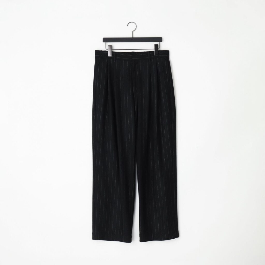 同じ素材を用いた「ウールストライプトラウザー」も展開。すっきりとしたシルエットに、タックによって生まれる自然なドレープが美しい。シャツとセットアップで着用すれば、端正なブリティッシュスタイルを体現できるだろう。加えて、自宅で洗濯可能な点も嬉しいポイント。繰り返し洗うことで生地に独特の風合いが加わり、経年変化を楽しむことができる。