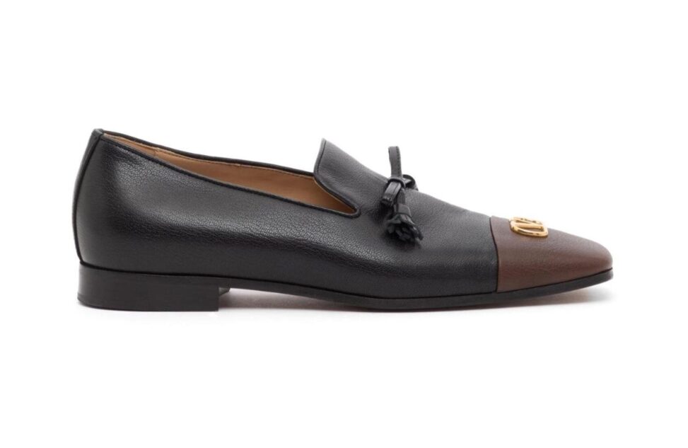注目は、かかとを踏んでスリッポンとしても履けるバブーシュ。上品な光沢を持つバイカラーレザーを用い、フロントにはブランドを象徴するVロゴのシグネチャーとタッセルリボンをあしらった。フォーマルなスタイルはもちろん、カジュアルな装いにも自然に馴染む汎用性の高さが魅力だ。
