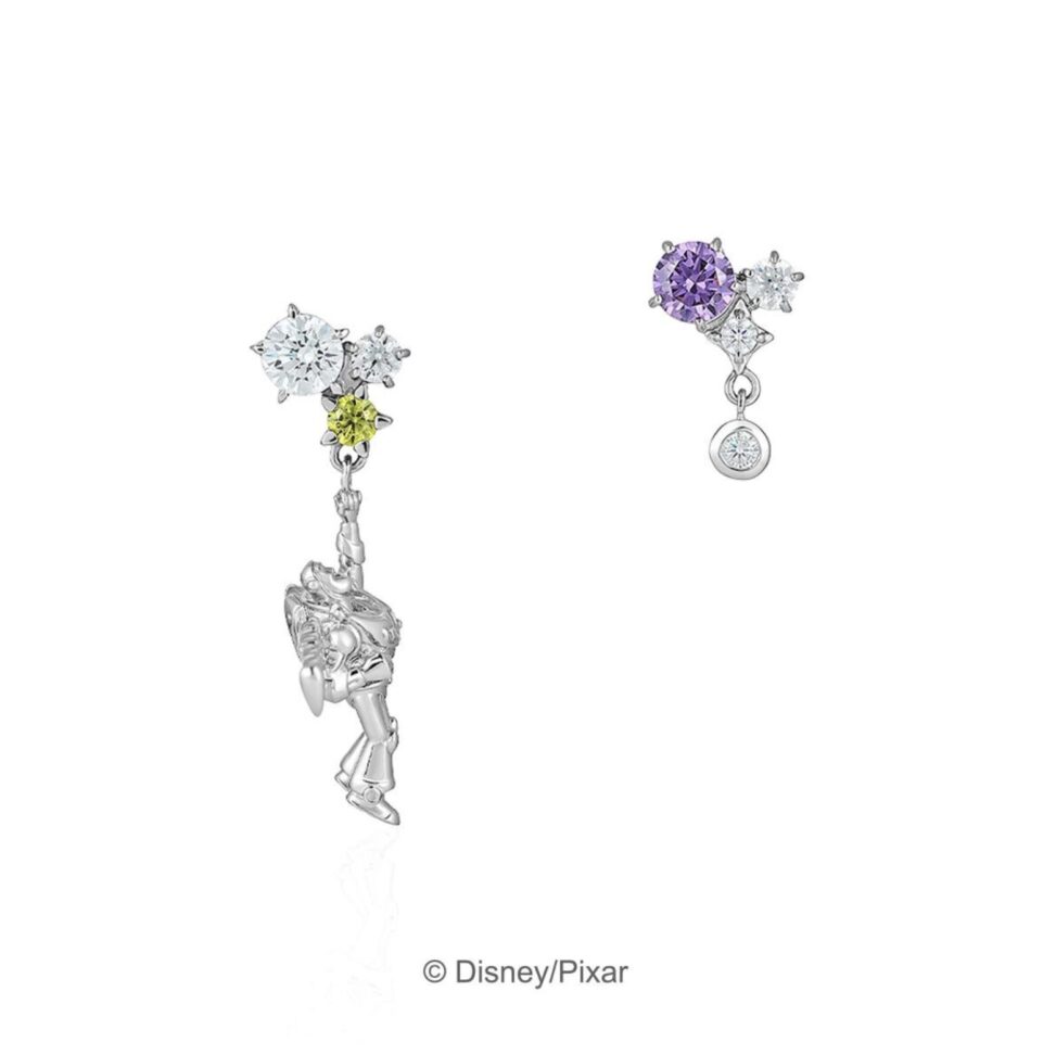 「バズ・ライトイヤー」をモチーフにしたアシンメトリーピアスでは、名セリフ「無限の彼方へ、さあ行くぞ!」の場面を立体的に表現。宇宙服をイメージしたグリーンやパープルのカラーストーンが輝き、インパクトあるデザインとなっている。価格は16,500円で、耳元に個性をプラスしたいときにおすすめのアイテムだ。