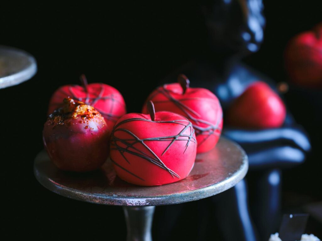 主役級スイーツのひとつは、『白雪姫』に登場する毒リンゴをモチーフにした真っ赤なムースケーキ。表面の光沢感とチョコレートのラインが妖艶さを放ち、中にはリンゴのコンポートを忍ばせた。甘酸っぱさと濃厚なチョコレートのバランスが楽しめる一品だ。