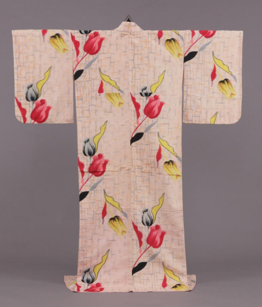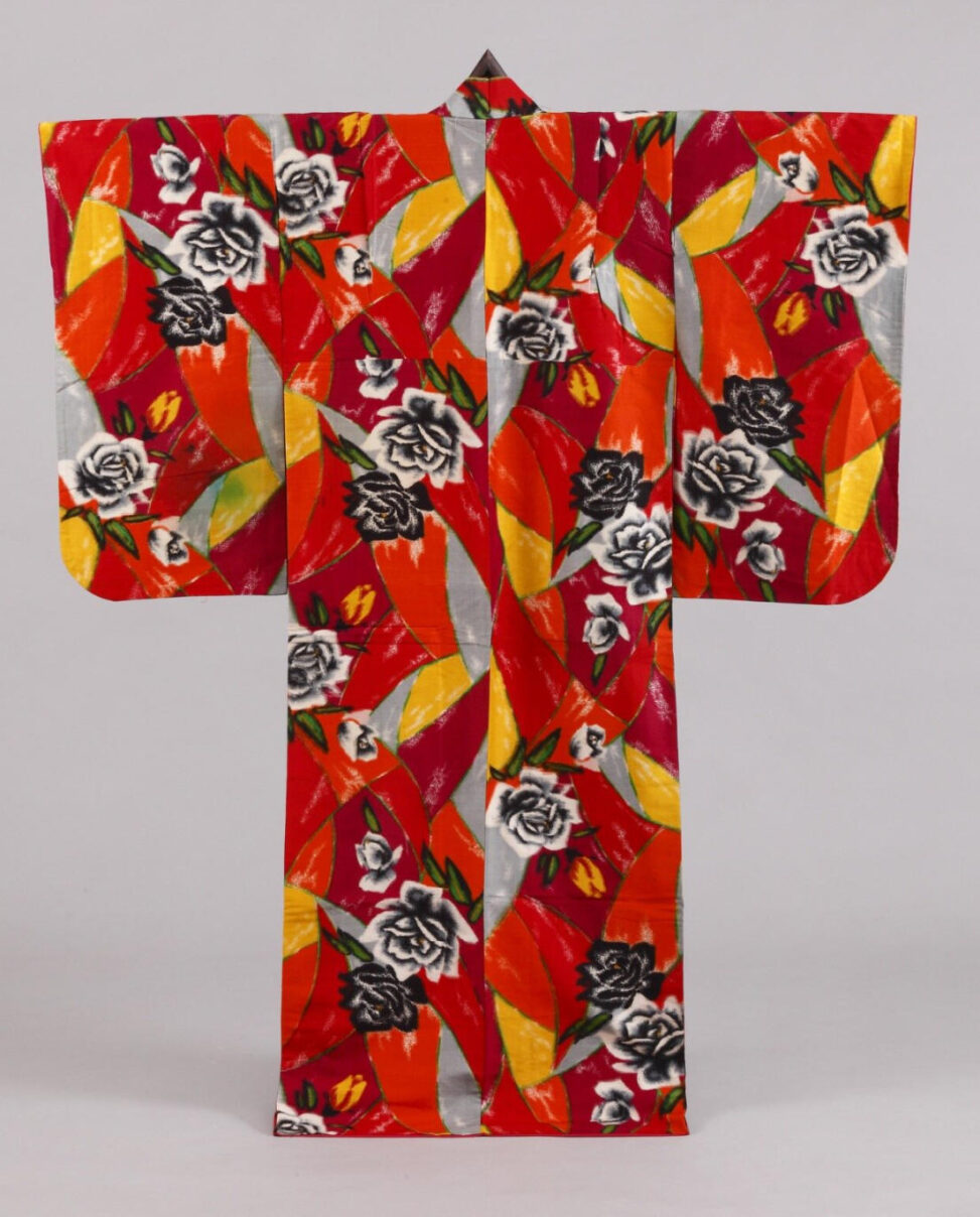 会場では、《桃色地煉瓦チューリップ模様銘仙着物》や《縹地紙風船模様銘仙着物》、《染分地薔薇模様銘仙着物》など、20世紀に制作された銘仙が展示される。幾何学模様や花柄、風船や薔薇などのモチーフが大胆な配色で織り込まれ、時代を超えても色褪せないモダンさを感じられる。こうしたデザインは当時の流行や生活文化とも結びついており、当時の女性たちがどのようにおしゃれを楽しんでいたかを垣間見ることができる。