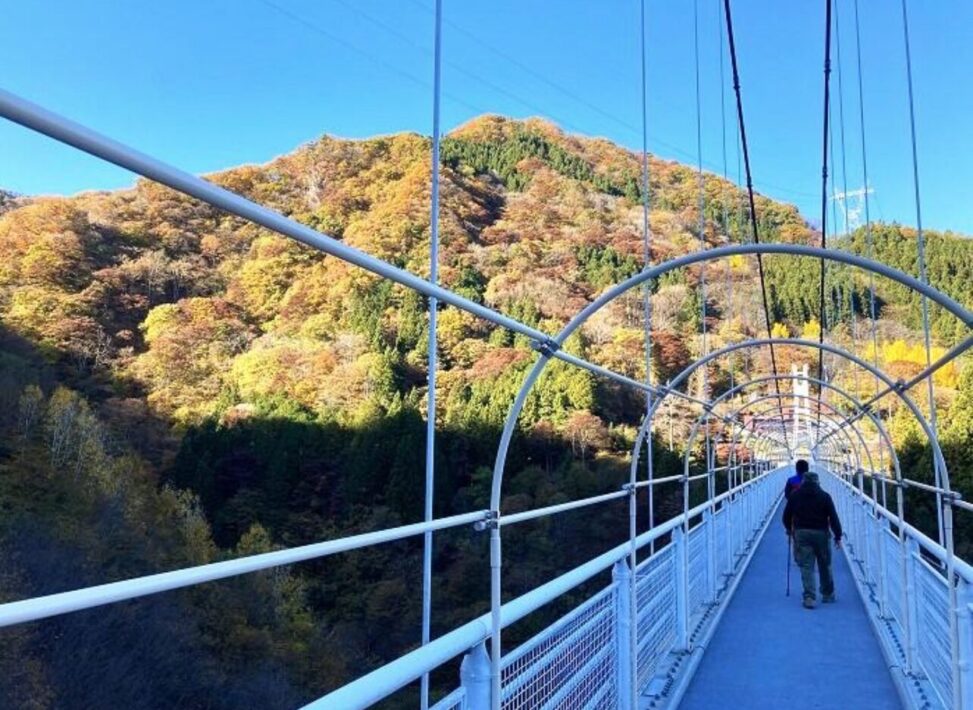 上野村を代表する観光名所といえば「スカイブリッジ」。長さ225m、高さ90mの歩行者専用吊り橋で、まさに天空の回廊です。眼下に広がる森を見下ろしながら歩く体験はスリル満点。料金はわずか100円、しかも30分ごとにシャボン玉が舞う演出まで。カップルや家族連れに人気なのも納得です。