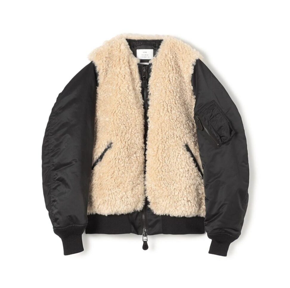 今回の新作は、ミリタリーの定番であるMA-1を、HYKEならではの視点で再デザインしたもの。最大の特徴は、身頃に配されたカールしたフェイクファー。従来のMA-1が持つ無骨なイメージを和らげ、都会的で洗練された印象を与えています。さらに中綿を仕込むことで、軽やかで暖かい着心地を実現。