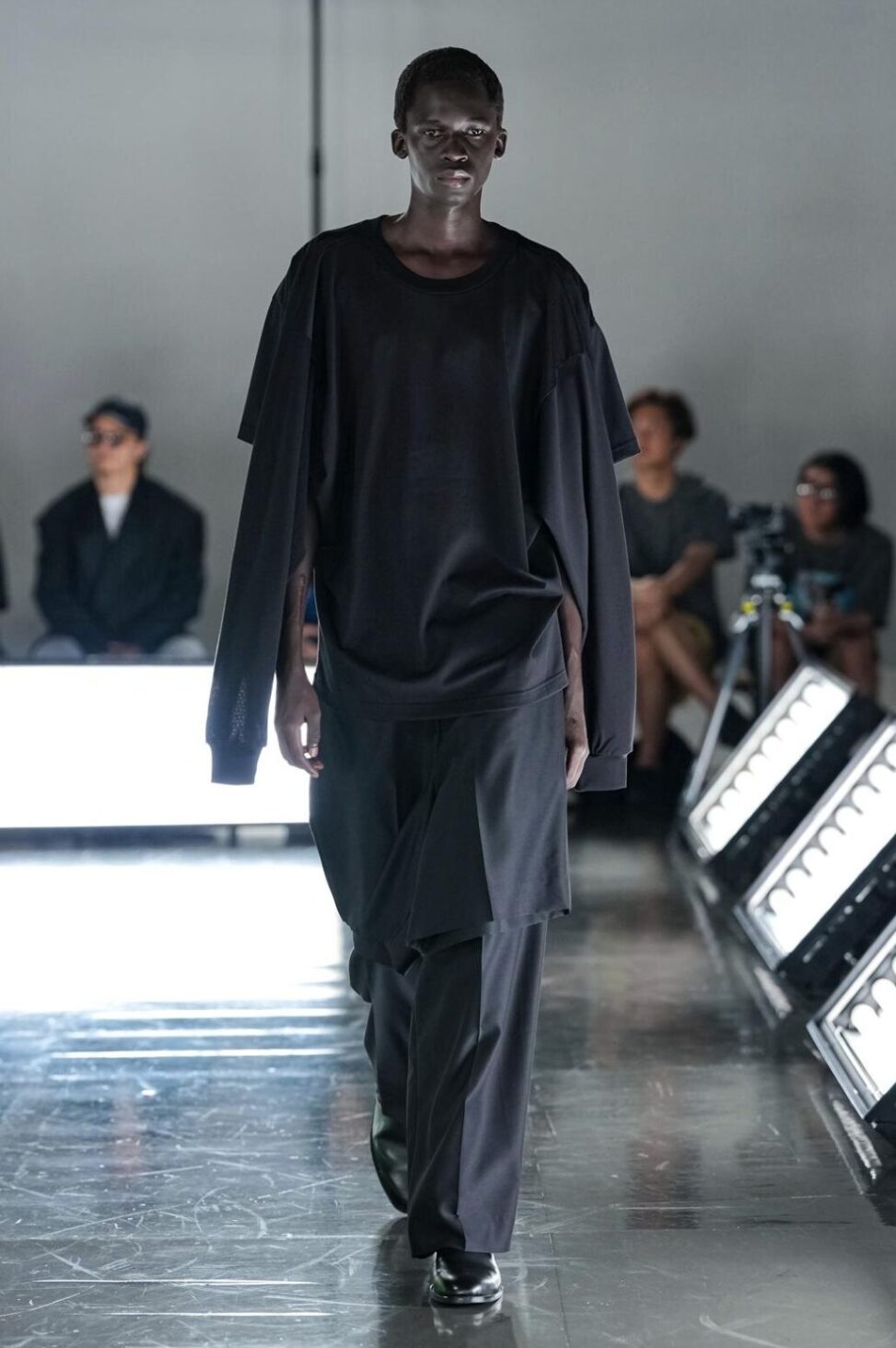 パンツも革新的で、ショートパンツとロングパンツを向かい合わせに一体化。ウエスト部分でつながっているため、片足が半ズボン、もう片足がロングパンツとして着用でき、“アンバランス”な着こなしを楽しめる。ロングジャケットや裏仕立てのテーラードジャケットもドッキングや立体パターンを用い、構造を意識したデザインが随所に見られた。