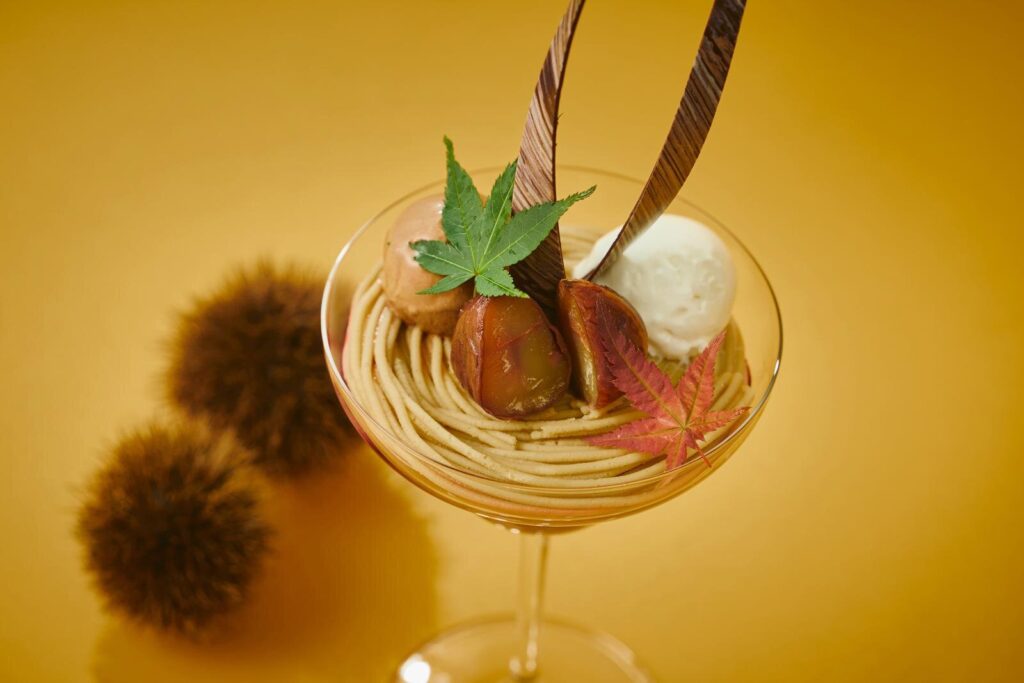 今回のアフタヌーンティーのテーマは「栗」。ティースタンドを彩るのは、芳醇な香りと深い甘みが特徴の丹波栗を使った多彩なスイーツだ。なかでも注目は、渋皮煮とモンブランクリームを重ねた贅沢なパフェ。トップに艶やかな栗の渋皮煮を飾り、濃厚なモンブランクリームの下には塩ミルクやチョコレートアイス、カシスの酸味を組み合わせ、華やかで奥行きのある味わいに仕上げている。