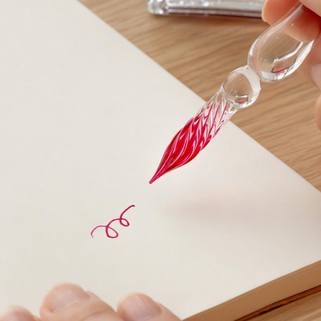 今回の目玉となるのは、ミッフィーをモチーフにした「ガラスペンボックスセット」。透明感あふれるガラス製のペンと専用のペン置きを組み合わせたセットで、クリアに輝く姿は思わず見惚れてしまうほど。専用ボックスにはミッフィーとフルーツが描かれており、手に取るだけで特別感が伝わる仕上がりだ。ガラスペンとあわせて使いたいのが、ミッフィーデザインのインクボトル。ストロベリーピンクとペアーグリーンの2色が展開され、鮮やかでシロップのような発色が手紙時間を一層楽しくしてくれる。