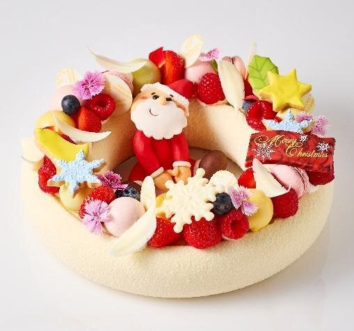今年は全5種類のケーキが用意され、見た目にも味わいにも特別感のあるラインナップが揃う。中でも目を引くのは、人と人とのつながりを象徴するリース型ケーキ「ル リアン」。滑らかなバニラムースの中に、苺やマンゴー、ピスタチオの球体ムースとコンフィチュールを閉じ込め、トップには色鮮やかなフルーツやマカロン、チョコレート、食用花を散りばめた華麗な一品だ。カットする場所ごとに異なるフレーバーを楽しめるのも魅力で、別添えのサンタクロース人形やアイシングクッキーを飾れば、さらに賑やかなクリスマスケーキに仕上がる。