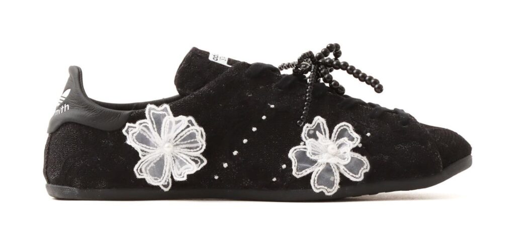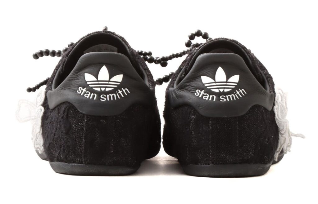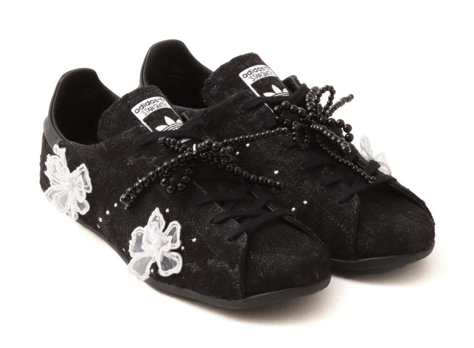 シューズ全体はブラックで統一しながら、アッパーには繊細な白いレースの花をあしらった。サイドのスリーストライプスは刺繍でステッチのように表現され、華やかさと上品さを兼ね備えたルックスに。スポーティなスタンスミスのイメージを保ちつつも、女性らしいディテールをプラスしているのが特徴だ。