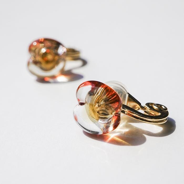 なかでも目を引くのが、赤く縁取られた「リンゴ」のピアスとイヤリング。ガラスならではの澄んだ質感で、みずみずしい果実をそのまま閉じ込めたような立体感が特徴だ。耳に寄り添うスタッド型で、可愛らしさと上品さを兼ね備えている。