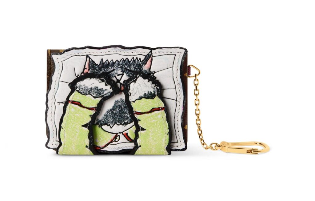 特に注目は、モノグラムキャンバスのショルダーバッグ。フロントにはグレース本人による手描きの猫イラストが大胆にあしらわれ、ユーモラスな表情と小さな手の仕草がチャーミングさを引き立てる。さらに、取り外し可能なゴールドチェーンを組み合わせることで、エレガントな雰囲気と実用性を両立させている。