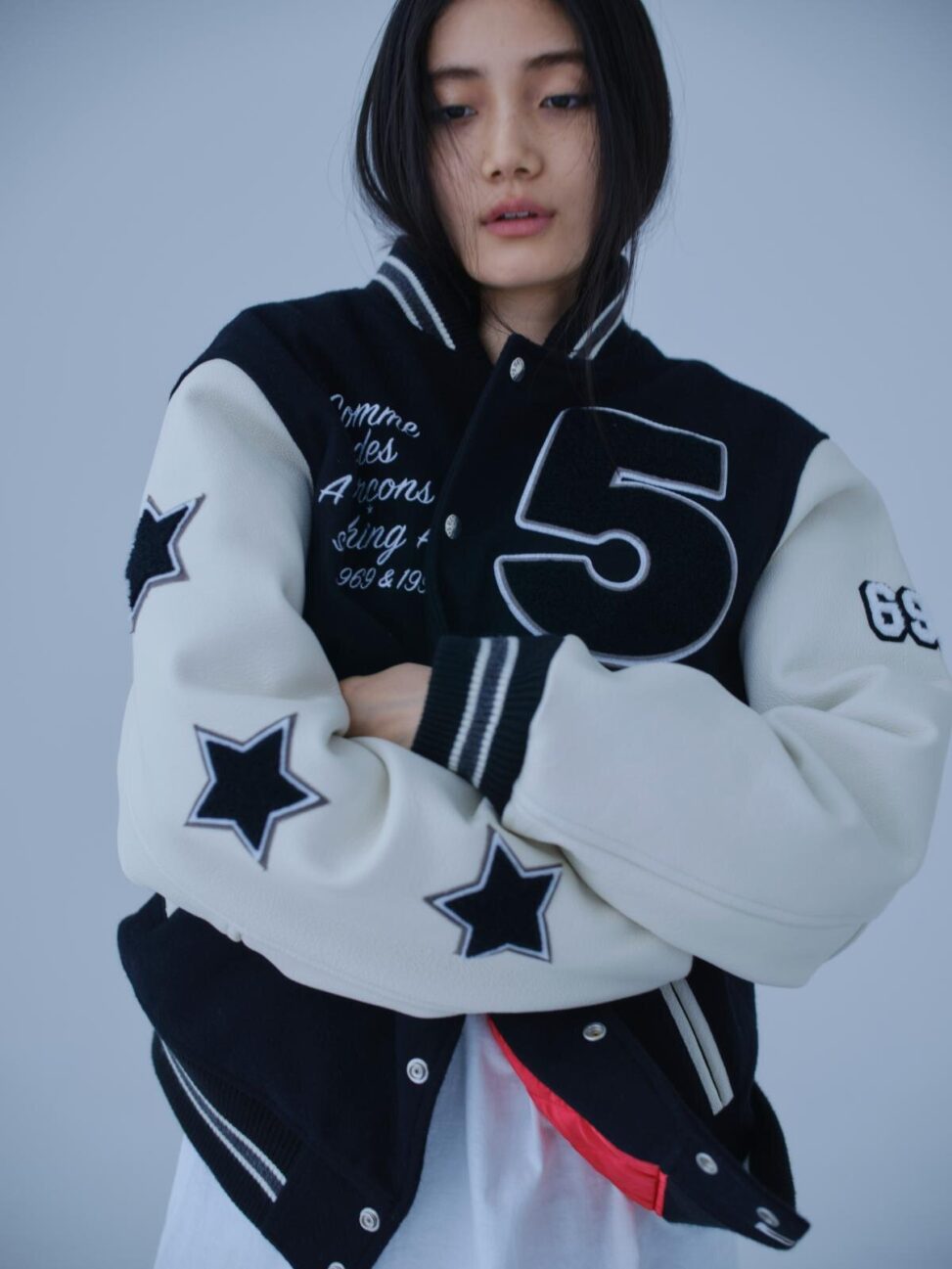 両ブランドのコラボレーションは2020年6月に初めて実現して以来継続しており、今回は大阪店のオープン5周年を記念した特別仕様。全9型がラインナップする中で、特に注目を集めるのはクラシカルなシルエットのバーシティジャケットだ。胸元には「5」の数字を象った大きなワッペン、袖には星型のワッペンが連なり、5周年を象徴するデザインに。裏地には鮮やかなレッドを採用し、モノトーンの外観とのコントラストが際立つ仕上がりとなっている。