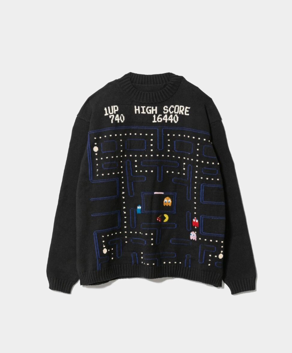 今回のコラボレーションでは、1980年に登場して以来世界中で愛されてきた「パックマン」の世界を、ファッションの視点で大胆に再構築。目玉アイテムとなるニットプルオーバーは、前身頃にゲームステージを、後ろ身頃にはスタート画面を模したグラフィックを配置し、まるでプレイ中の画面をそのまま身にまとったかのようなデザインに仕上げている。インターシャ、ジャカード、刺繍という3種類の技法を駆使し、クッキーの数や配置といった細部に至るまで忠実に表現しているのも特徴だ。また、背面のグラフィックは上下を反転させることで、服の「上下」という固定観念を揺さぶる、ブランドらしいユーモラスな仕掛けが施されている。