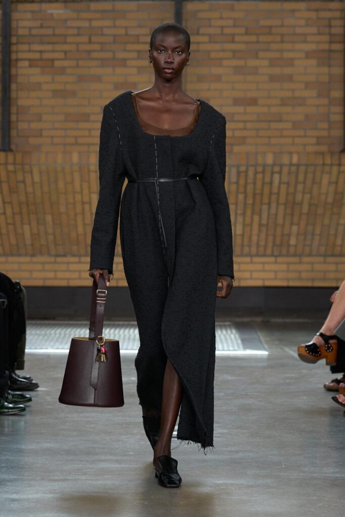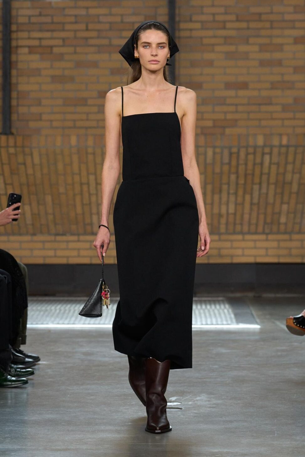 例えば、白や黒のエプロンドレスは直線的なシルエットを採用し、ミニマルでありながらエレガントな印象に。余分な要素を一切排除することで、ピュアで洗練された美しさが際立った。また、トレンチコートはざっくり羽織るスタイルで登場し、シャツやデニムと合わせることでリアルなニューヨーカー像を映し出す。一方、テーラードジャケットはドロップショルダーを取り入れて構築感を和らげ、スーツにはくるぶし丈で履くトラウザーを合わせ、軽快さと遊び心を加えている。