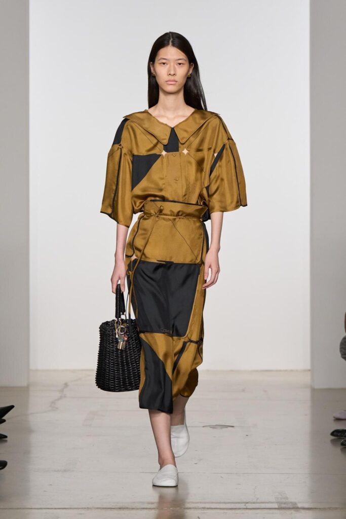 素材面では、洗いをかけたテクニカルファブリックが軽やかな空気感を演出し、とろみのあるジャージー素材は流れるようなドレープラインを描き出すなど、バリエーション豊かな生地使いも魅力だ。クラシックとモダン、日常と非日常を横断するような仕立てが、見る者の想像力を膨らませる。