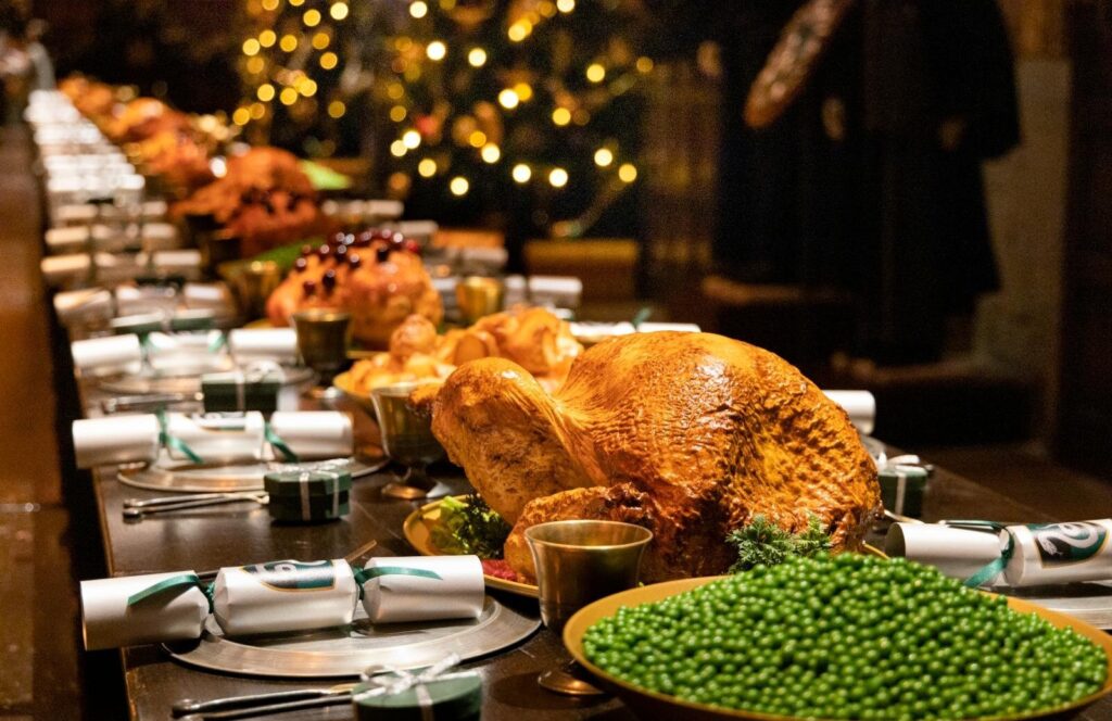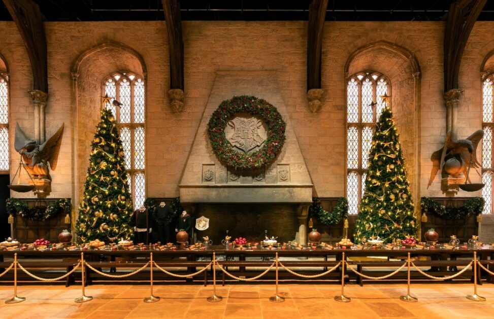 施設全体がクリスマス仕様に彩られる中、特に圧巻なのは大広間の演出だ。高さ5メートルを超えるクリスマスツリーにはリボンやオーナメントが煌めき、ダイニングテーブルには七面鳥やケーキといったご馳走、さらに山のように積まれたプレゼントが並ぶ。そして新たに登場するのが、天井から宙に浮かぶ約400本のキャンドル。炎の揺らぎをライトで表現し、幻想的な光景を描き出す。これは映画『ハリー・ポッターと賢者の石』でハリーが初めて大広間に足を踏み入れたシーンを彷彿とさせる演出だ。撮影当時は実際に炎を灯したキャンドルが使用されていたが、安全面から以降は視覚効果で表現されたという裏話も興味深い。
