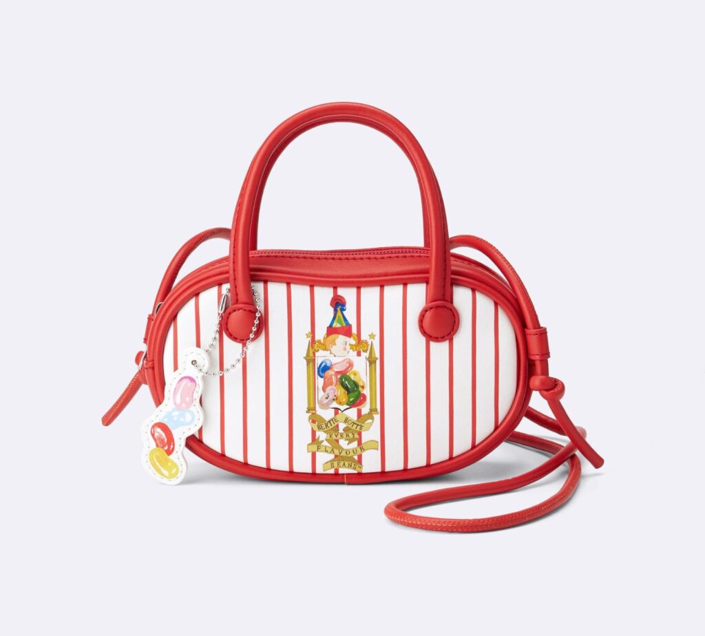 スウェットパーカには「蛙チョコレート」のグラフィックをプリント。袖口には蛙チョコレートを模した小さな刺繍が施され、細部までこだわりのあるデザインとなっている。また、バッグも見逃せないポイント。ビーンズ型のミニバッグは、連なった百味ビーンズのチャームが付属し、ユニークさを強調。丸型の蛙チョコレートバッグには、蛙のイラストを描いたチャームをプラスしている。どちらもハンドバッグとショルダーバッグの2WAYで使える実用性の高さも魅力だ。