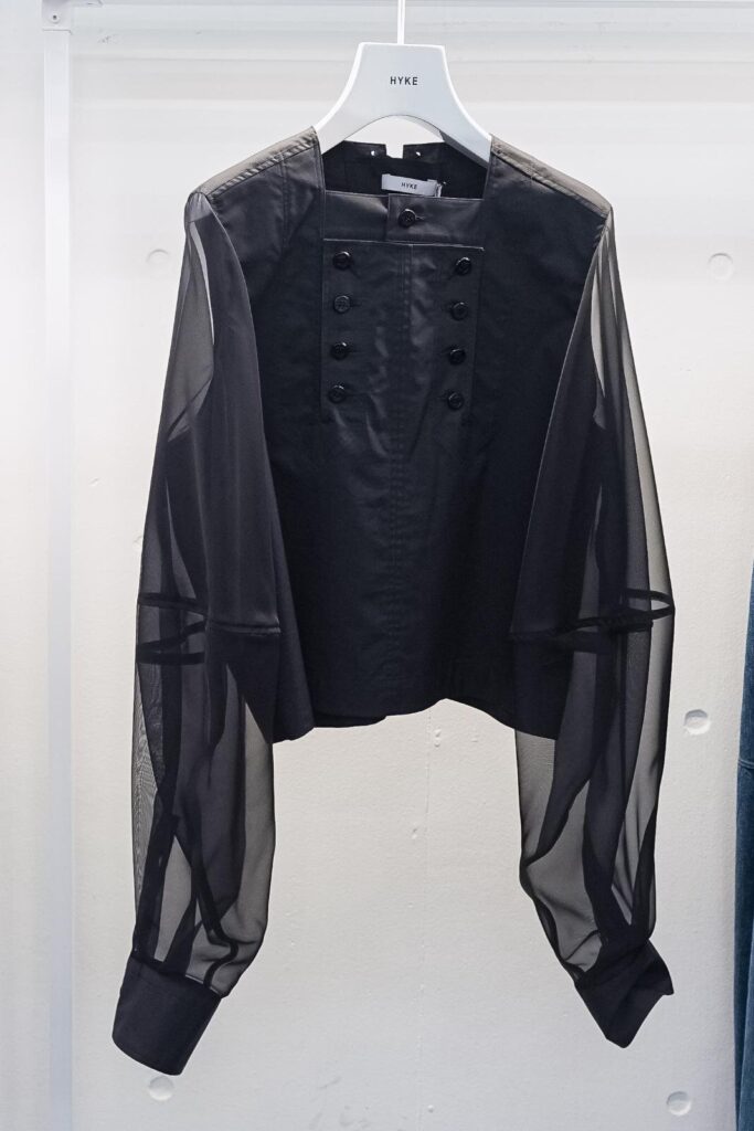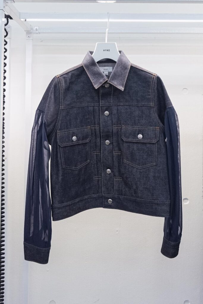 また、今季は“シアー素材”を取り入れたレイヤードスタイルが豊富に展開されるのも大きな特徴。ブランドの定番アイテムであるデニムジャケットは、袖部分を透け感のある素材で切り替え、バルーンスリーブを採用。ハードな印象のデニムに柔らかさを加え、女性らしいエレガントな雰囲気へと昇華させている。