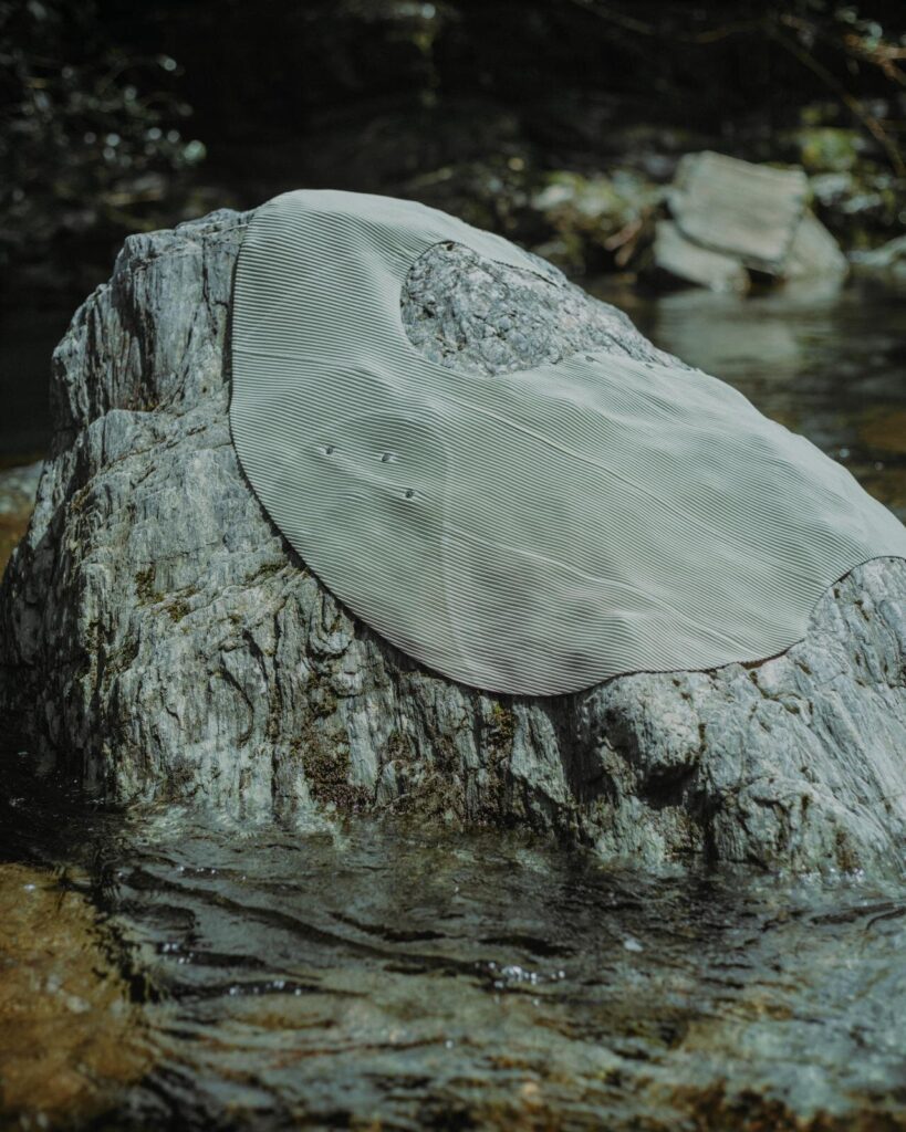 中でも注目は、ケープのように体を包み込むプリーツベスト。これは水流や微生物の作用で石に穿たれた穴の造形を平面化してパターンに落とし込んだユニークな一着だ。複数のスナップボタンが配されており、留める位置を変えることでフォルムが自在に変化。着る人それぞれの感覚でアレンジできるのも魅力となっている。