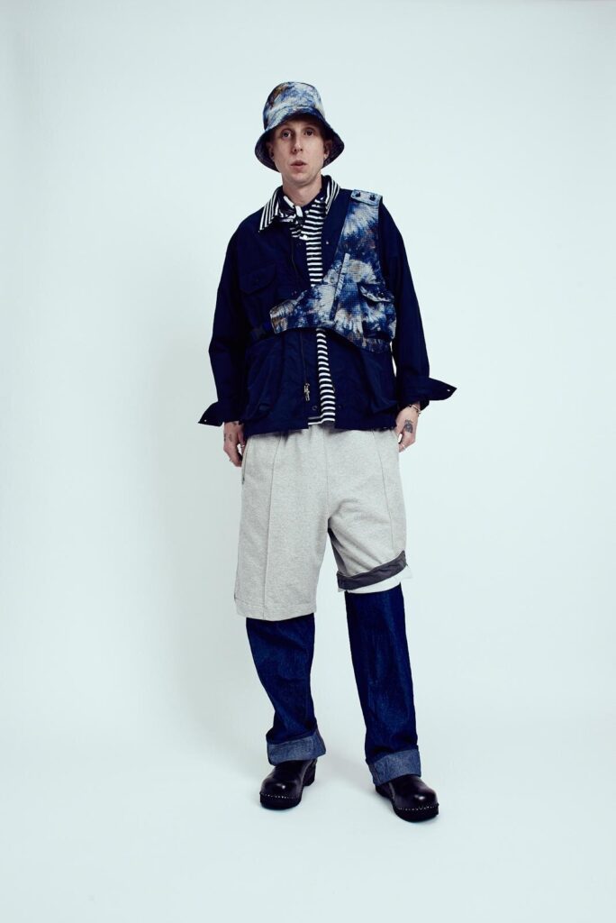 コレクションの軸となるのは“モノクローム”と“ツートーン”。ブランドを象徴するワークテイストに、音楽文化のグラフィカルな要素を重ね合わせている。ブルゾンやパンツに配されたフラッグチェックは、格子の幅を大小で切り替えることで大胆かつ軽快なリズムを生み出す。さらに、ジオメトリック柄のシャツや、足跡をモチーフにした総柄パーカなど、遊び心あるデザインもラインナップ。