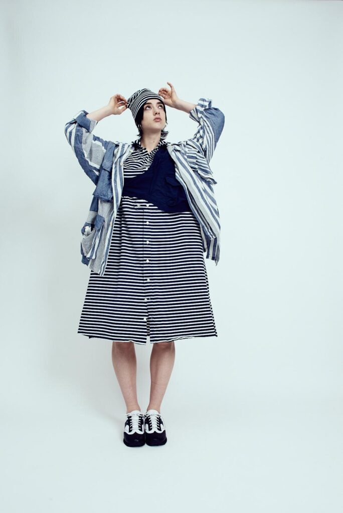 また、「ザ・スペシャルズ」の着こなしを意識したスリーピース・セットアップも登場。ジャケットとベスト、シャツを重ねたクラシックなレイヤードに加え、ジャケットの上から半身のベストを重ねるアレンジや、ボトムスにラップスカートを合わせる提案など、着こなしの自由度を大きく広げている。サスペンダーやボウタイ、ストールといった小物も揃い、細部まで音楽カルチャーの息吹を感じさせる。