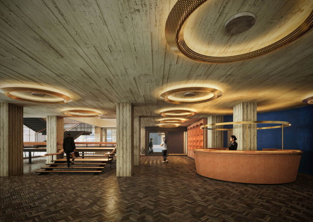 館内デザインには、この旧庁舎の意匠や素材が随所に取り入れられる。たとえば、カフェの壁面には彫刻家・辻晋堂による泰山タイルアート《海・波・船》が再利用される予定。さらに、村野が“手すりの名手”と称された所以でもある大階段の手すりも、ホテルの吹き抜け空間に移設され、優美な曲線美を伝える。客室やロビーの色合いも、旧庁舎で使用されていたタイルや家具、絨毯の色彩を参照し、過去と現在をつなぐデザインに仕上げられている。