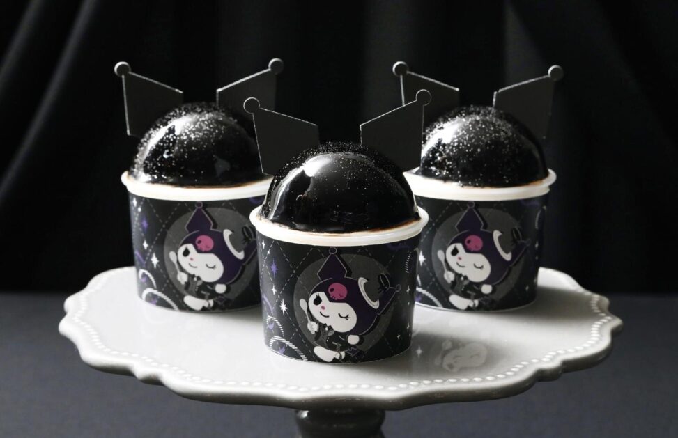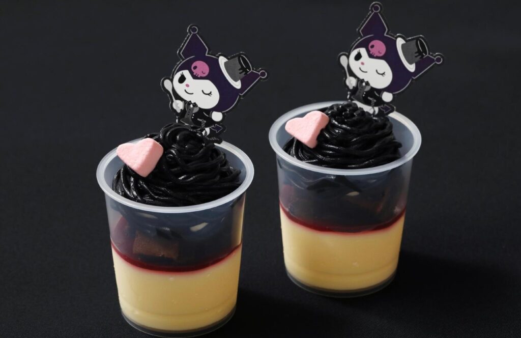 メインとなるのは「クロミのまっくろずきんプリン」。黒く光沢のあるドーム型プリンに、クロミの耳をかたどったデコレーションを添えたユニークな一品だ。スリーブにはシックな衣装を纏い、頭にプリンを乗せたクロミのイラストをプリント。中身は竹炭パウダーを加えた真っ黒なチョコプリンと、ふんわりとしたバニラムースの二層仕立てで、見た目も味わいも特別感にあふれる。