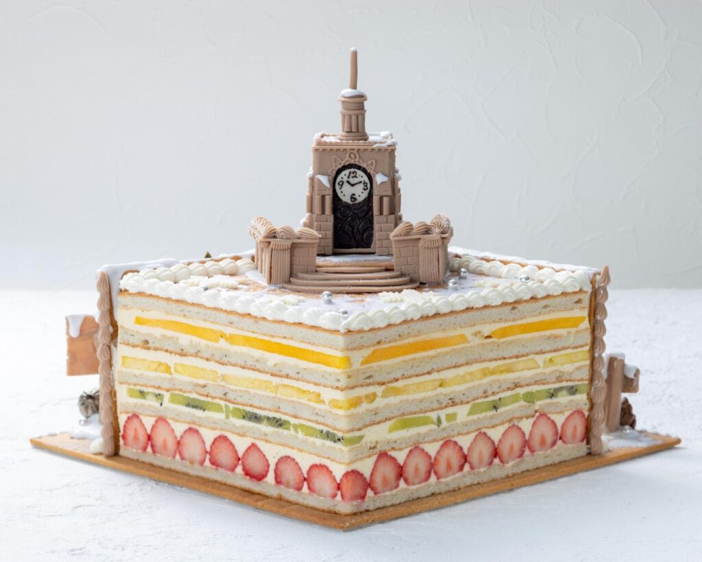 なかでも注目を集めるのが「Noël de WAKO」。まるで童話の一場面のように立体的で華やかな仕上がりのビッグサイズケーキだ。アーモンドの香ばしい風味を閉じ込めたダックワーズ生地を土台に、イチゴ・キウイ・パイナップル・マンゴーといった4種類のフルーツを贅沢にサンド。クリームと果実のジューシーな甘みが重なり合い、食べ応えも抜群だ。さらに建物部分はクッキーやチョコレートの細工で精巧に表現され、サンタクロースやクリスマスツリーの装飾が加わることで、見た目にも心躍る一品に仕上がっている。およそ20名でシェアできるサイズ感のため、パーティーや大人数の集まりにふさわしいケーキといえる。